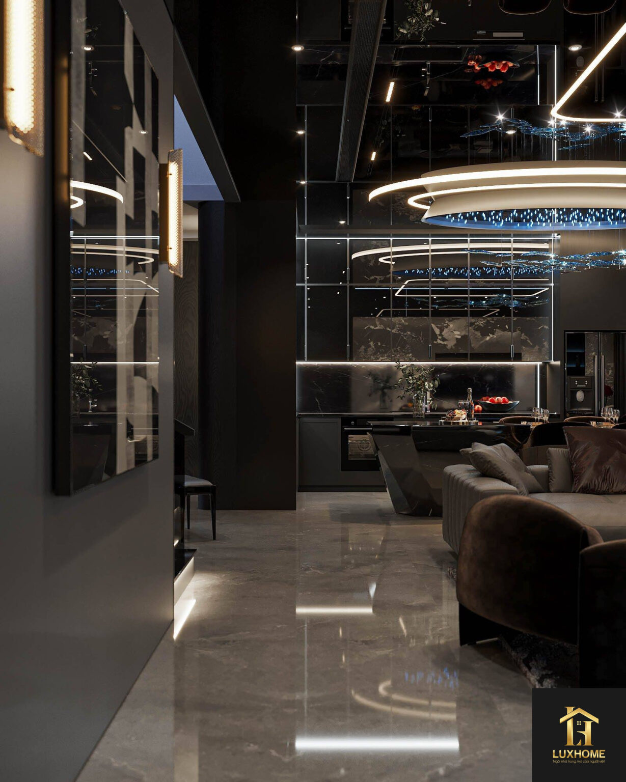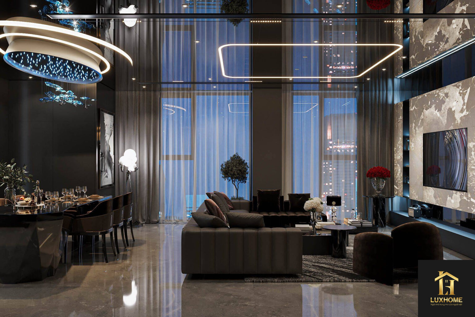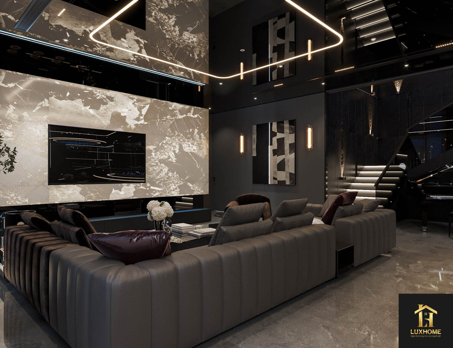 Phòng khách được thiết kế theo phong cách hiện đại, sử dụng gam màu tối như đen và ghi xám làm chủ đạo, tạo nên một không gian mang tính mạnh mẽ, huyền bí và cá tính, thể hiện rõ nét sự cá nhân hóa của gia chủ. Điểm nhấn chính là hệ bàn đảo với thiết kế hình khối độc đáo (black diamond) và vách tivi sử dụng hệ đá xuyên sáng ấn tượng.