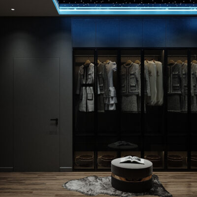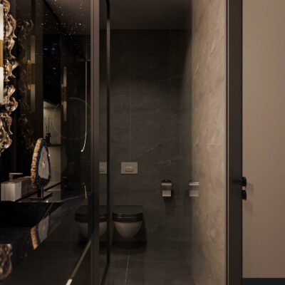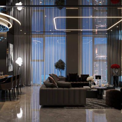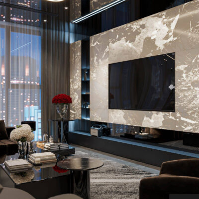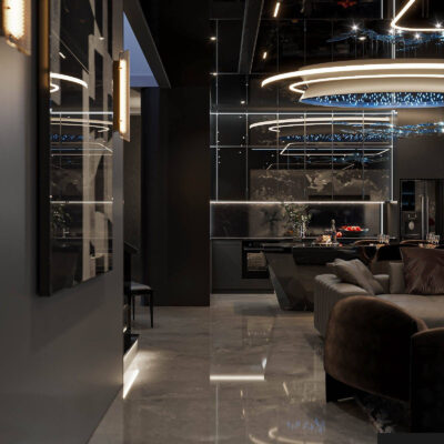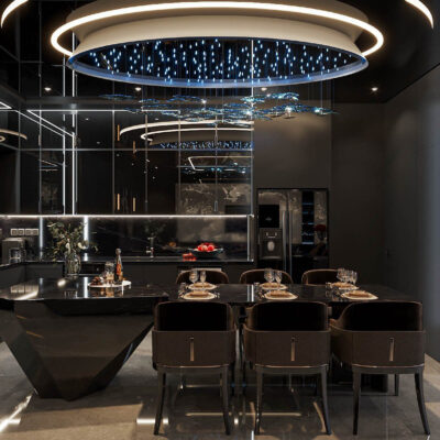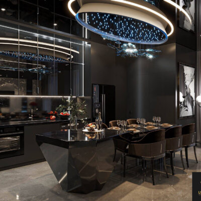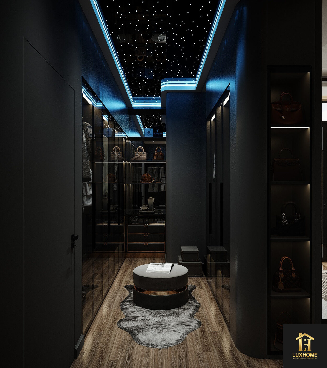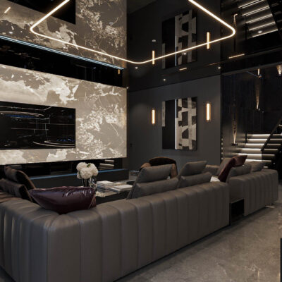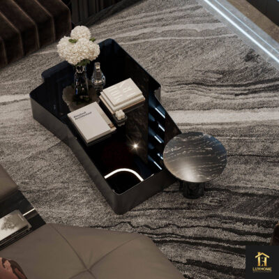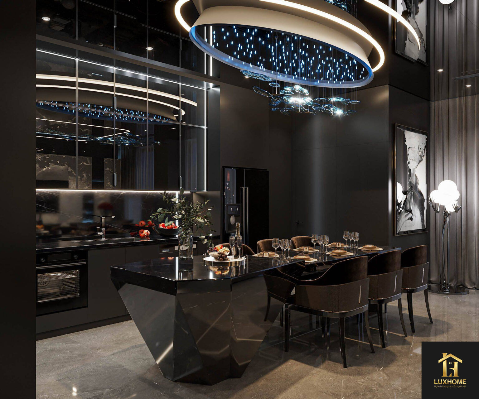 Phòng khách được thiết kế theo phong cách hiện đại, sử dụng gam màu tối như đen và ghi xám làm chủ đạo, tạo nên một không gian mang tính mạnh mẽ, huyền bí và cá tính, thể hiện rõ nét sự cá nhân hóa của gia chủ. Điểm nhấn chính là hệ bàn đảo với thiết kế hình khối độc đáo (black diamond) và vách tivi sử dụng hệ đá xuyên sáng ấn tượng.