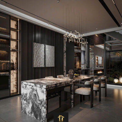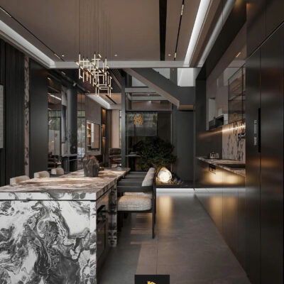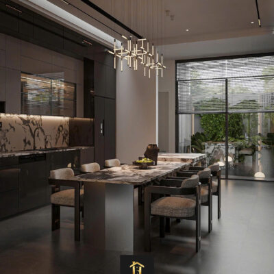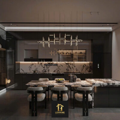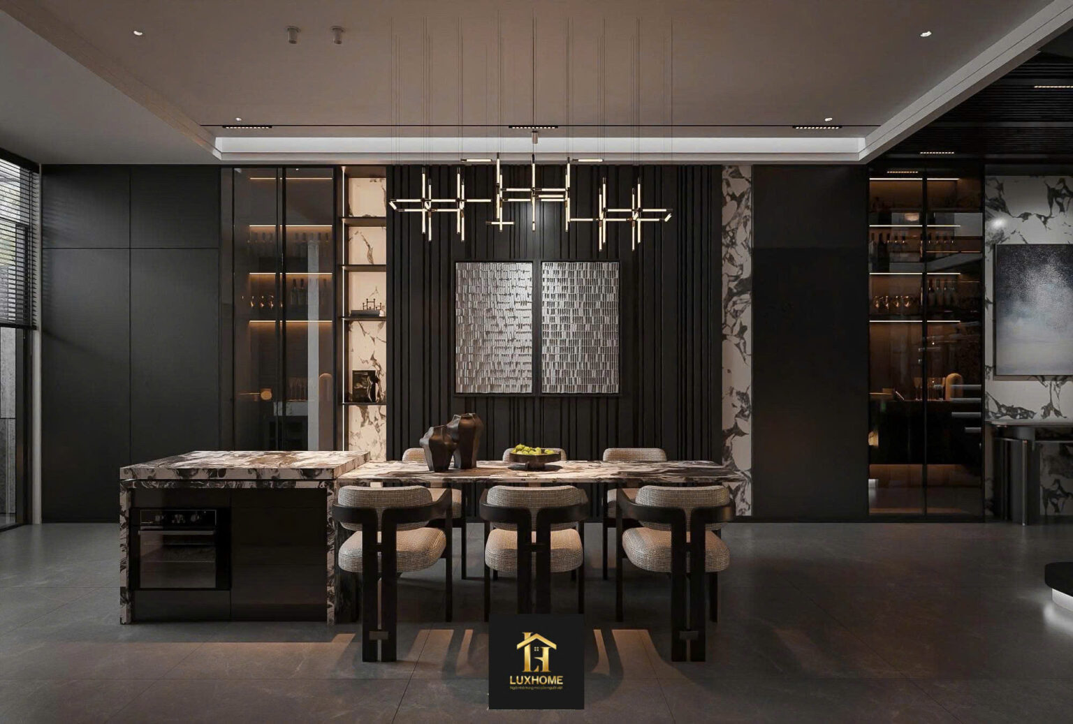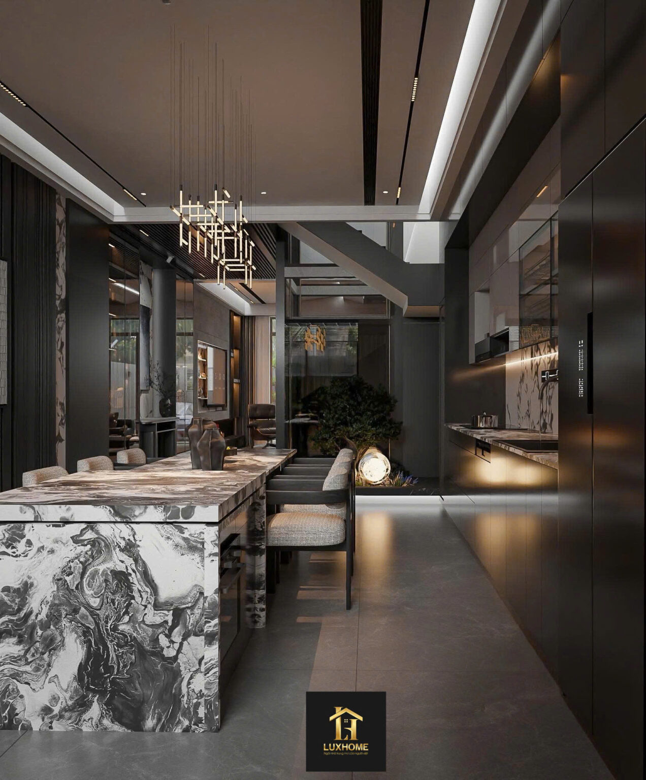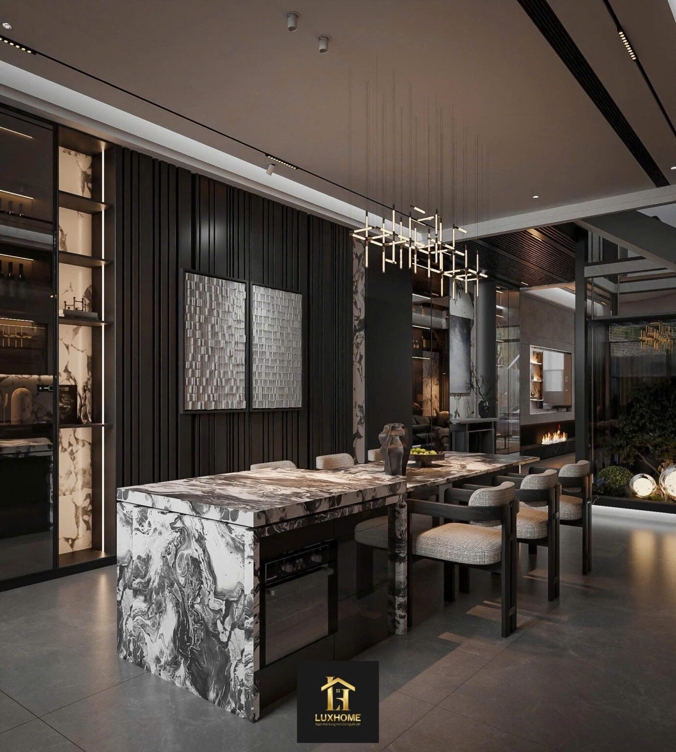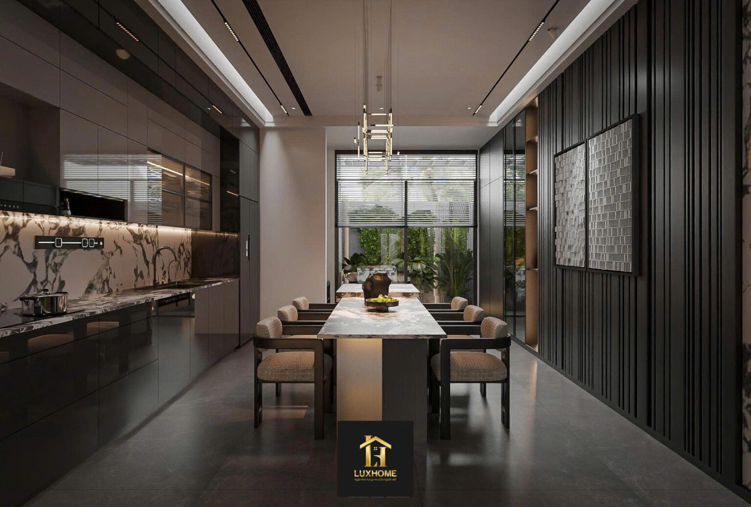 Phòng bếp khoảng 40m² được thiết kế mở, liền kề phòng khách, theo xu hướng “kitchen island” phổ biến trong biệt thự hiện đại. Tủ bếp acrylic bóng gương từ Đức, mặt đá granite đen chống trầy xước và dễ vệ sinh. Đảo bếp trung tâm với ghế bar cao cấp, lý tưởng cho bữa sáng nhanh hoặc tiệc gia đình.