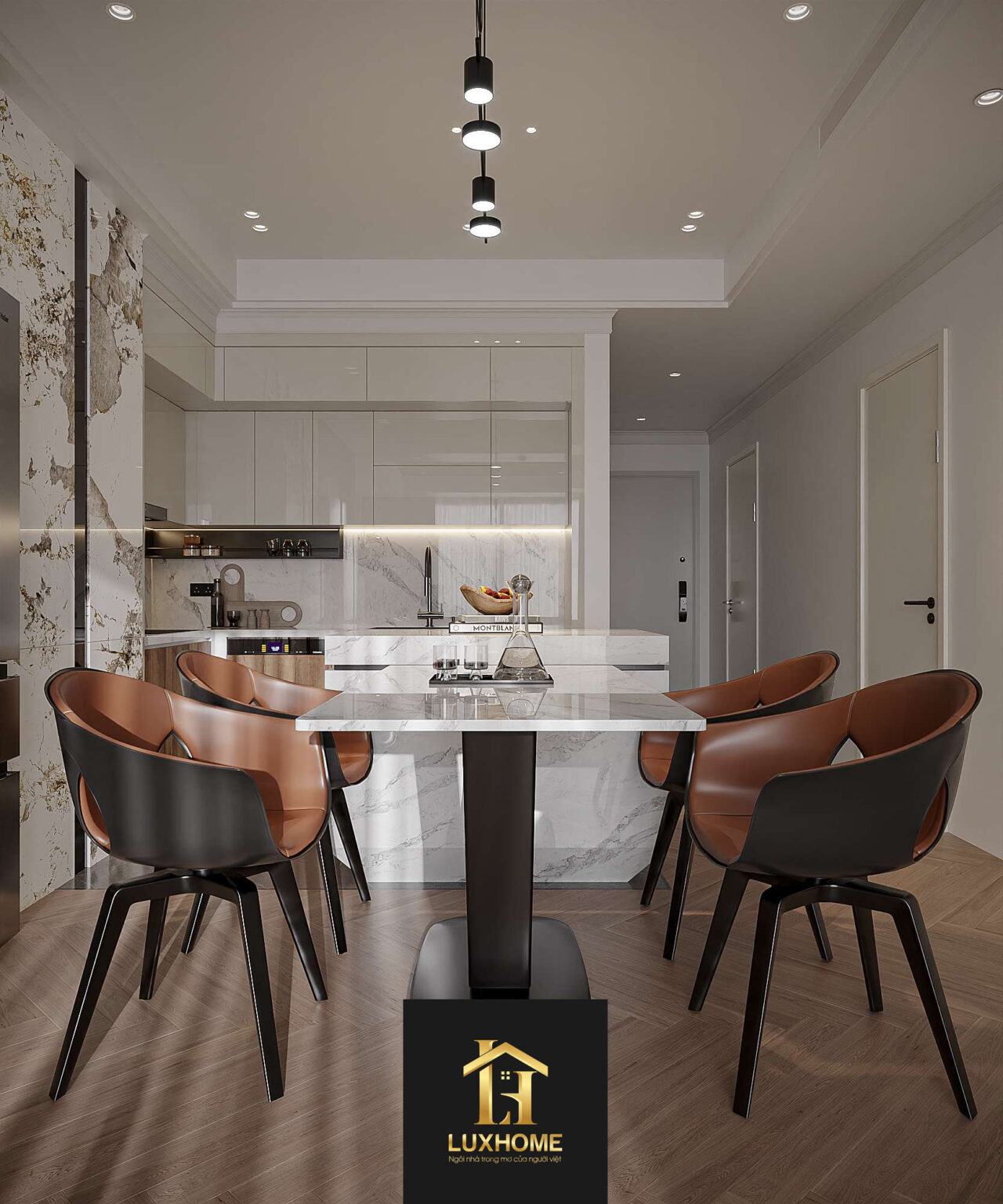 Hệ thống cửa kính lớn được bố trí khéo léo giúp mở rộng tầm nhìn, đón sáng tự nhiên, kết nối không gian sống bên trong với phố phường bên ngoài. Bảng màu trung tính chủ đạo: trắng, ghi sáng, nâu gỗ mang lại cảm giác rộng rãi, thư thái, đồng thời dễ dàng phối hợp nội thất để thể hiện cá tính riêng của gia chủ. Từng chi tiết nhỏ từ tay vịn cầu thang, đèn chiếu sáng, cho đến vật liệu ốp lát đều được Luxhome lựa chọn tỉ mỉ, hướng tới sự tinh tế và bền vững theo thời gian.